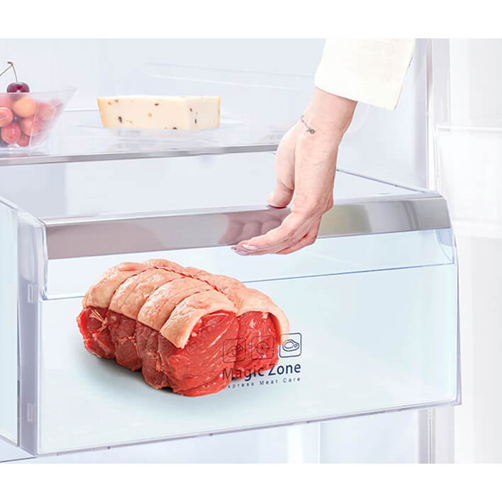 یخچال فریزر ساید بای ساید 0034 دوو مجهز به درب سوم و هوم بار با سامانه سرمایش فلزی است. این سیستم از هدر رفت سرما جلوگیری کرده و تازگی و کیفیت مواد غذایی را حفظ می کند. برای نگهداری گوشت تازه می توانید از محفظه ویژه تعبیه شده در ساید بای ساید دوو D4S-0034SS استفاده کنید. دما در این محفظه 4 درجه سانتی گراد بوده که می تواند گوشت تازه را تا 6 ساعت، سالم نگه دارد.