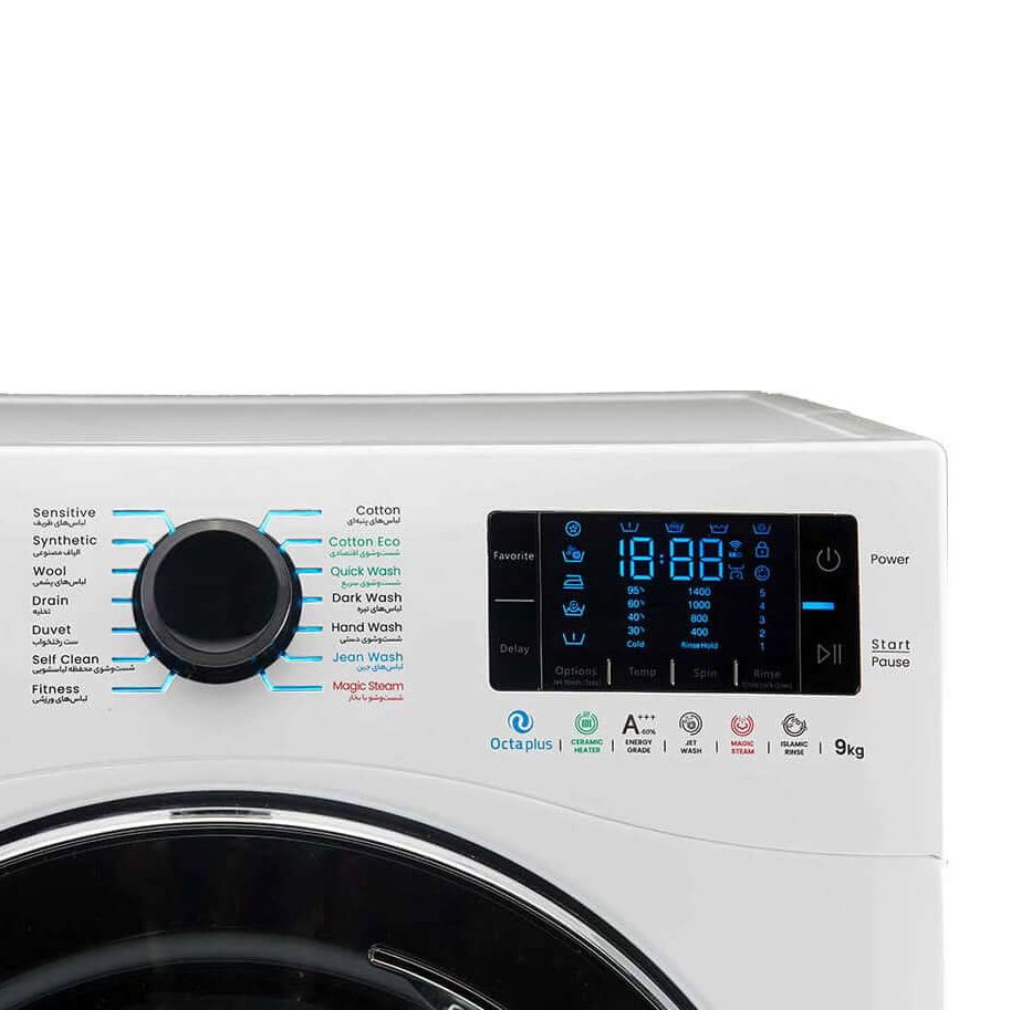 ماشین لباسشویی اسنوا SWM-E91W، کد جدید 94W51، دارای سیستم IOT، موتور اینورتر، 14 برنامه، نمایشگر LED، انرژی +++A، بخارشوی، نانو سیلور، عیب یاب و … است.