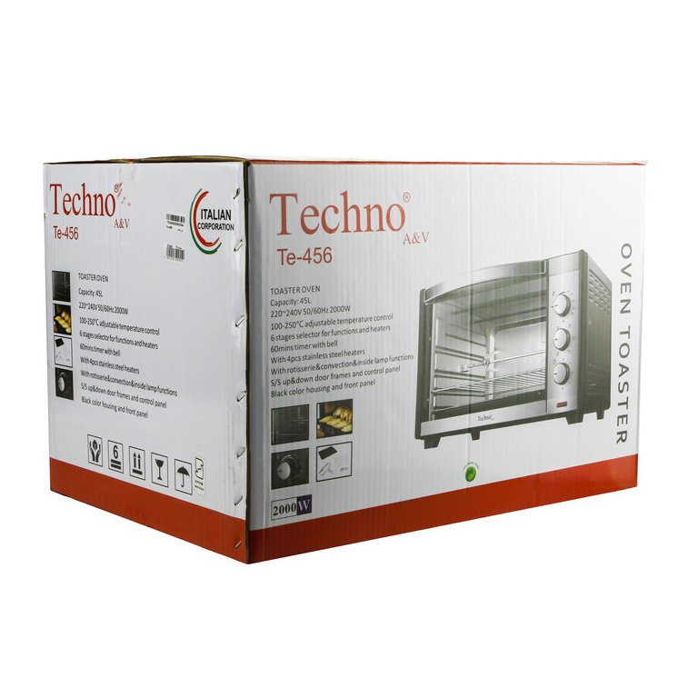 آون توستر تکنو TE-456 محصولی فوق العاده از برند تکنو دارای قابلیت تنظیم دما از 100 تا 230 درجه، جوجه گردان، تایمر 60 دقیقه ای، لامپ داخلی و ظرفیت 45 لیتر است.