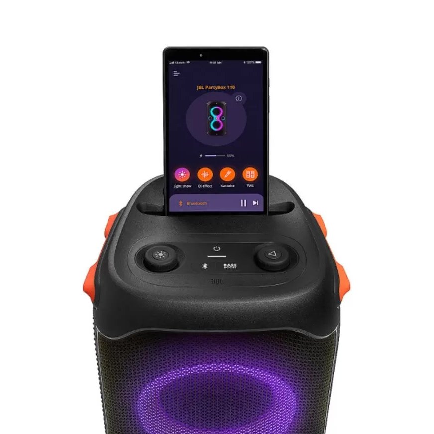 اسپیکر جی بی ال Party Box 110 امکان اتصال با سیم یا بی سیم داشته و مجهز به رقص نور، فناوری TWS Mode و قابلیت کارائوکه است.