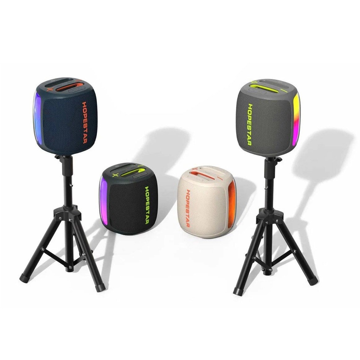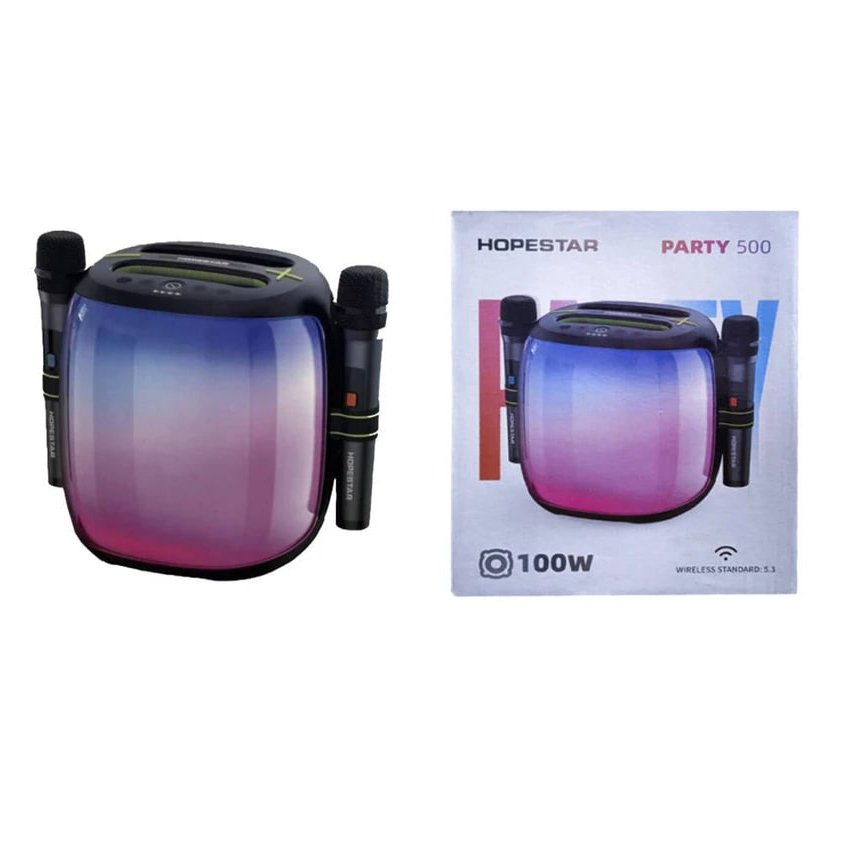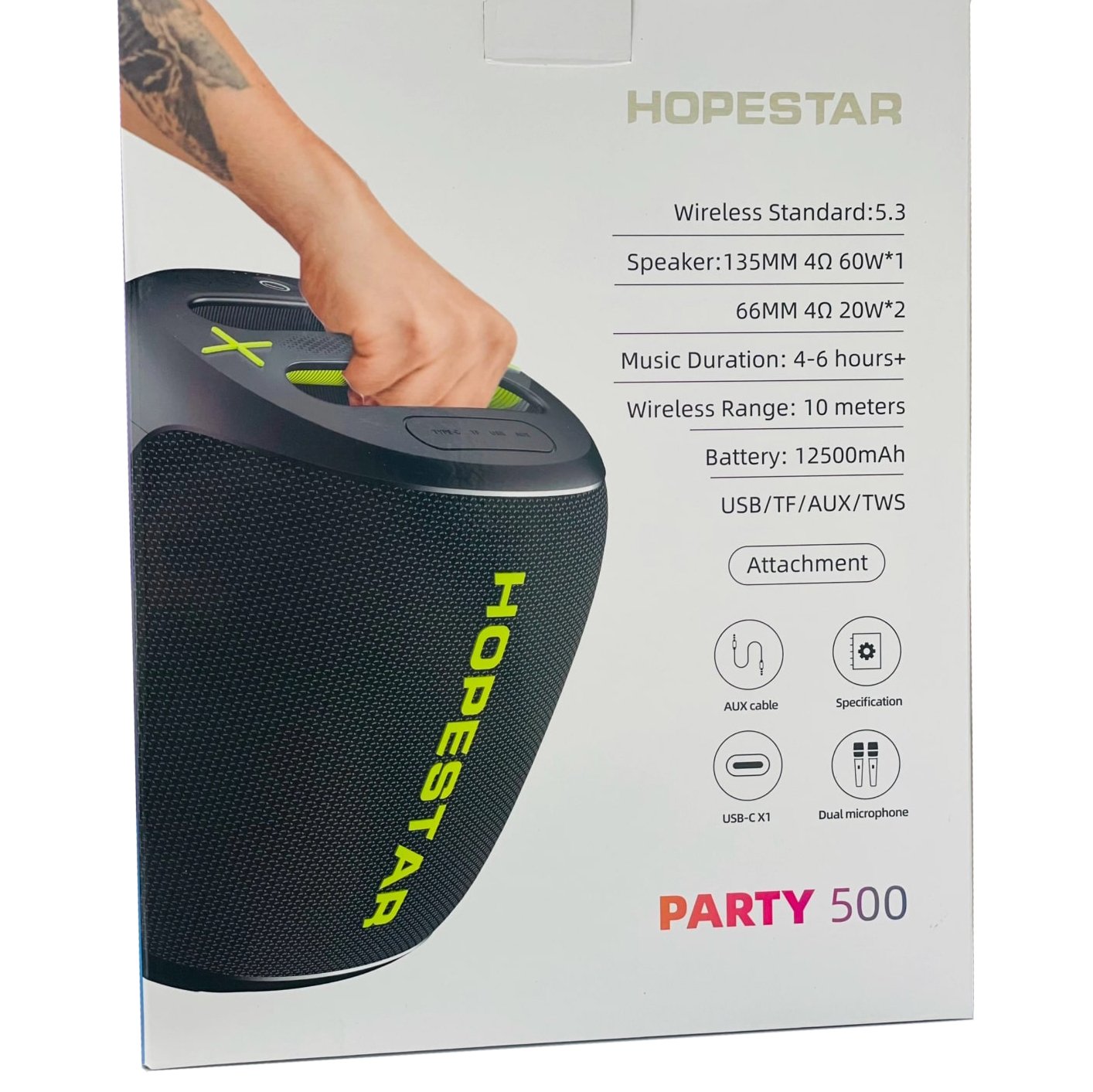 اسپیکر هوپ استار Party 500B مجهز به رقص نور RGB، بدنه مقاوم و ضد آب، باتری 12500 میلی آمپر، توان خروجی 100 وات و درگاه های AUX، کارت حافظه و USB می باشد.