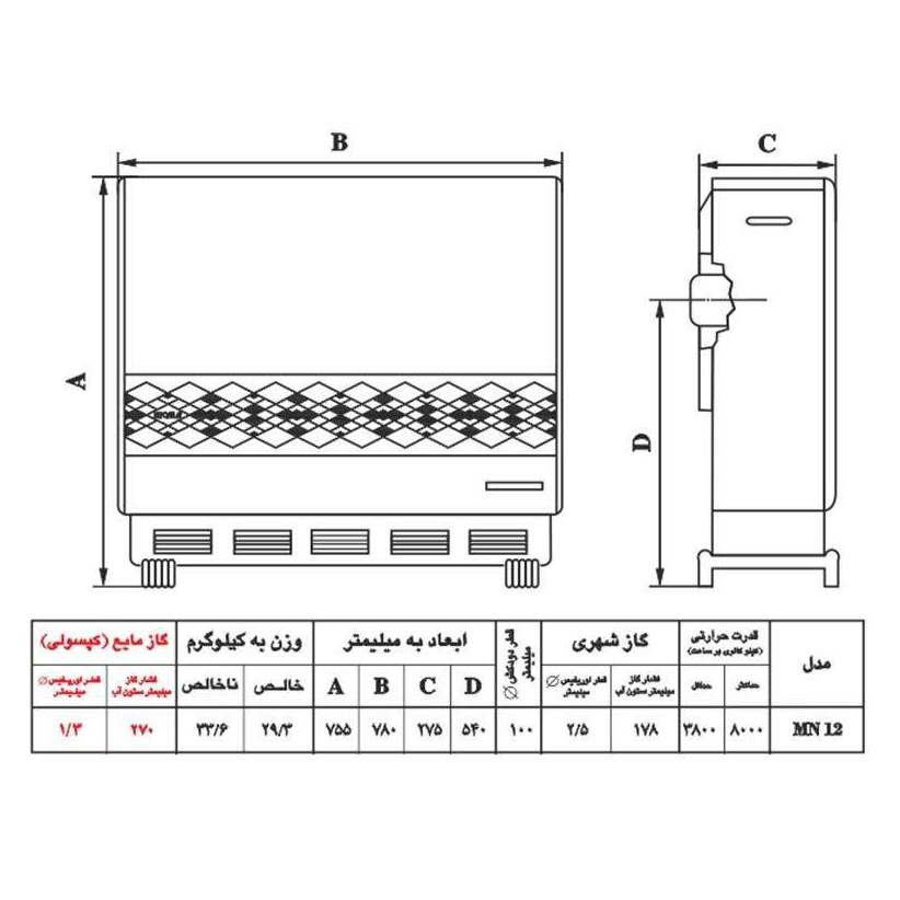 حجم گرمادهی به میزان تقریبی 175 مترمکعب – دارای جرقه زن – شیشه ایمن – قابلیت تنظیم دما – قابلیت نصب بر روی زمین – کم مصرف – مجهز به سیستم ایمنی ODS – قطع خودکار گاز در صورت کاهش 18 درصدی اکسیژن – مجهز به سیستم گاورنر |