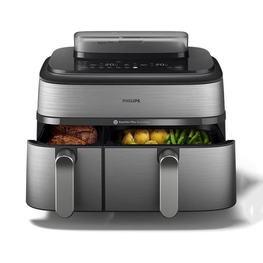 سرخ کن دوقلو فیلیپس NA555/09 یکی از پیشرفته ترین و جدیدترین محصولات شرکت فیلیپس Philips است که با ظرفیت بالای خود برای مهمانی و دورهمی ها و یا خانواده های پرجمعیت 7 نفره طراحی شده و می تواند به عنوان یک دستیار عالی در طبخ انواع غذاهای لذیذ و پخت کیک های خوشمزه به کاربر کمک کند. این مدل بدنه ای از جنس استیل و پلاستیک دارد و با رنگ جذاب استیل نمای بسیار زیبایی به آشپزخانه شما می بخشد. از طرفی قیمت سرخ کن دوقلو فیلیپس NA555/09 نیز در مقایسه با امکانات فراوان آن بسیار اقتصادی و مناسب بوده و این دستگاه را به گزینه ای فوق العاده برای آشپزخانه های مدرن تبدیل می کند.