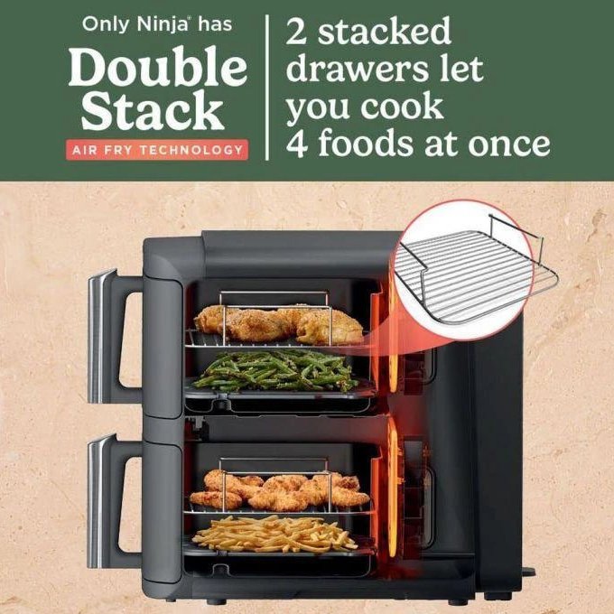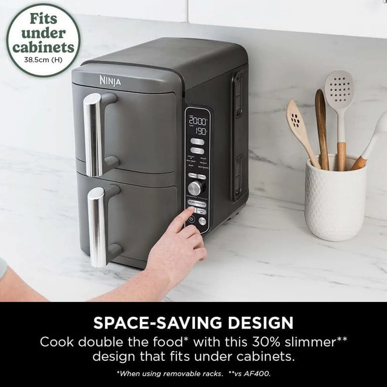 سرخ کن دوقلو نینجا مدل SL400 خاکستری با توان 2470 وات از سرخ کن های قدرتمند بازار به شمار می آید و عملکرد پخت را 75 درصد سریع تر از فن های فردار انجام خواهد داد. این مدل دارای دو سبد کشویی از جنس روکش نچسب و ضدخش بوده و نمایشگر لمسی در کنار دستگاه زیبایی آن را چند برابر کرده است. همچنین دارای یک توری فلزی می باشد تا کاربر آن را به عنوان استند درون مخزن قرار دهد و بتواند دو مواد غذایی را با شرایط پخت یکسان آماده کند.