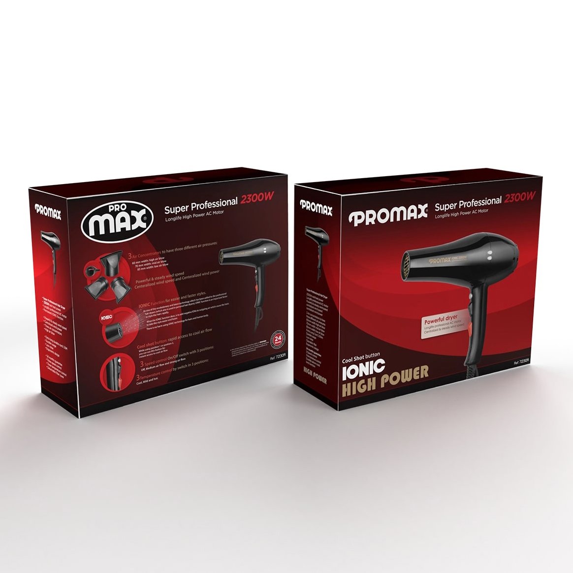 سشوار پرومکس 7230R مجهز به توان 2300 وات، موتور AC، فناوری آیونیک، باد سرد، قابلیت تنظیم حرارت و فشار باد، سری دیسپانسر و متمرکز کننده و باد سرد می باشد.