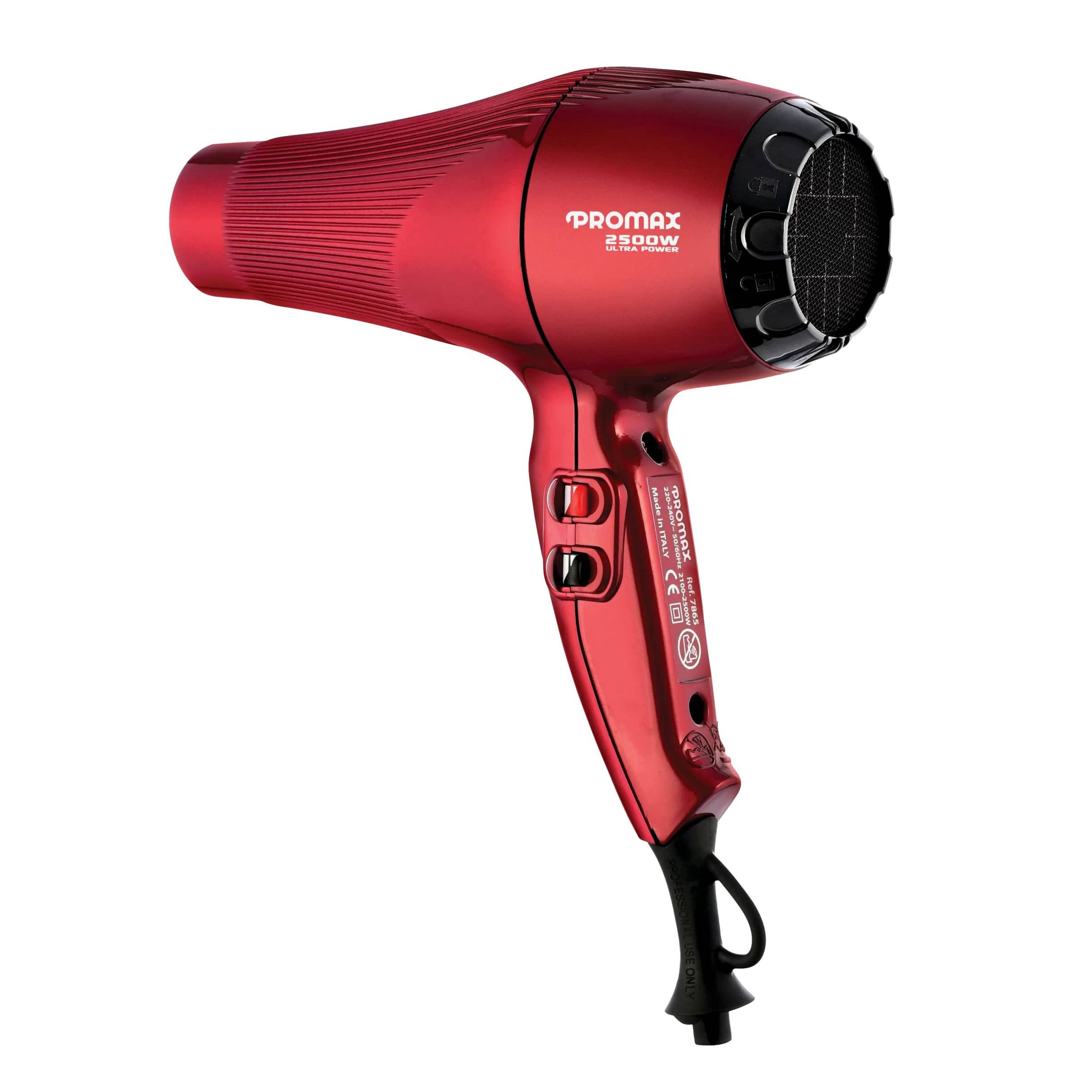 سشوار پرومکس 7865 به کابل برق 3 متری، موتور AC با توان 2500 وات، 3 حالت دما، کنترل دو سرعته، 2 متمرکز کننده هوا، المنت سرامیکی و حلقه آویز مجهز می باشد.