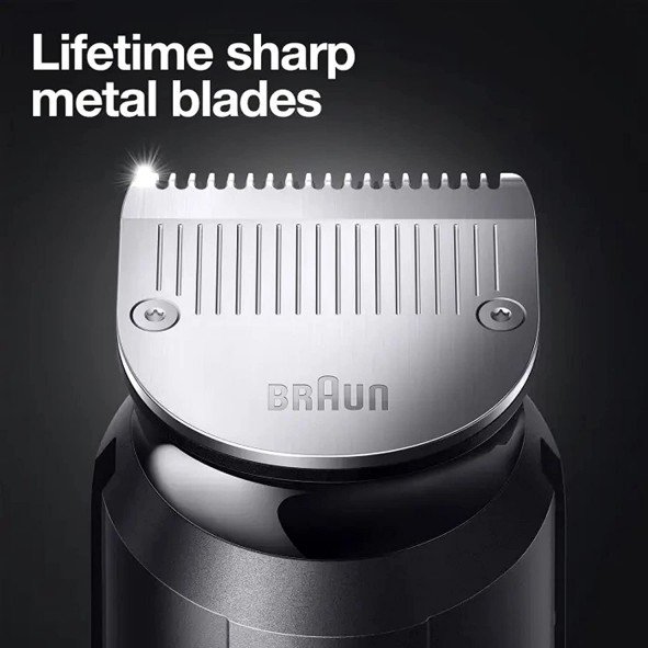 ماشین اصلاح براون MGK7331 دارای عملکرد ضد آب، موتور AutoSense، باتری لیتیوم یون با نشانگر روی بدنه، شارژ سریع 5 دقیقه، شانه های قابل تنظیم و تیغه استیل است.