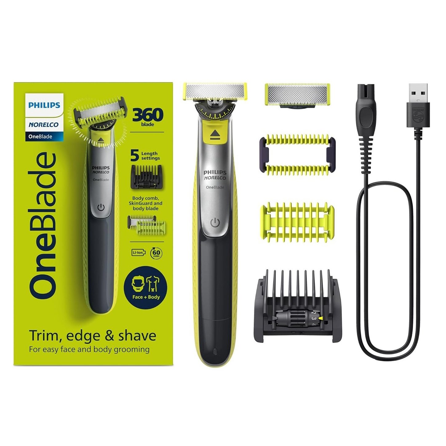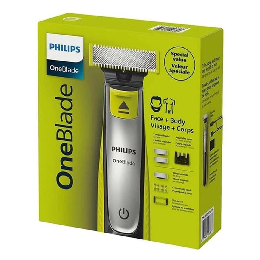 طراحی ارگونومیک – باتری لیتیوم یون Li-Ion – فناوری OneBlade – سیستم محافظ دوگانه Glide Coating و Rounded Tips – برس تمیزکننده – دارای دو عدد تیغه مخصوص صورت و بدن و سه عدد شانه 5 در 1 قابل تنظیم، 3 میلی متری و محافظ پوست – نشانگر وضعیت شارژ باتری – سیستم محافظ دوگانه Dual Protection – کابل USB A – استفاده به صورت خشک و مرطوب – ولتاژ 5 ولت – توان مصرفی 1 وات – فناوری Contour following |