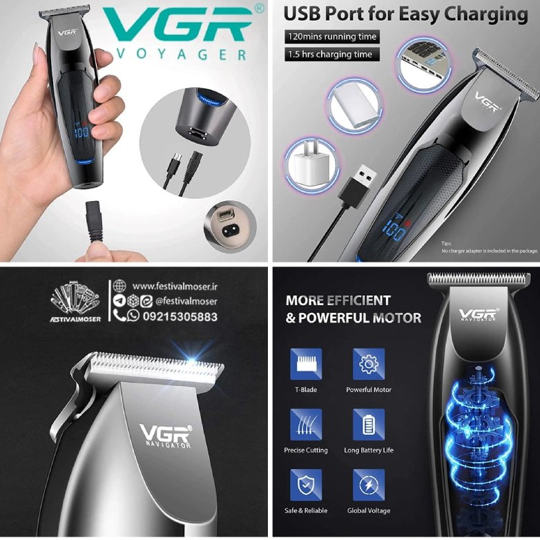 ماشین اصلاح وی جی آر V-070 مجهز به باتری لیتیوم یون با مدت زمان کارکرد 120 دقیقه، حالت توربو، نمایشگر LED، پنچ عدد شانه متنوع و قابلیت خط زن می باشد.