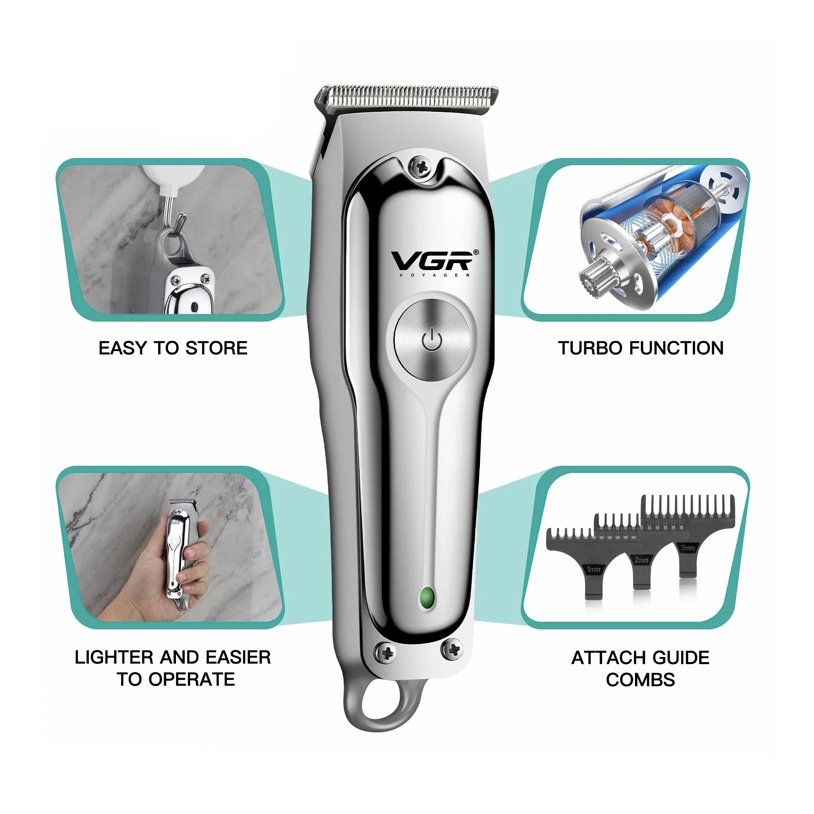 ماشین اصلاح وی جی آر V-071 دارای باتری لیتیوم یون قابل شارژ، تیغه استیل، ۴ شانه متنوع، عملکرد ضد آب، نشانگر باتری، بدنه ABS و تکنولوژی برش مستقیم می باشد.