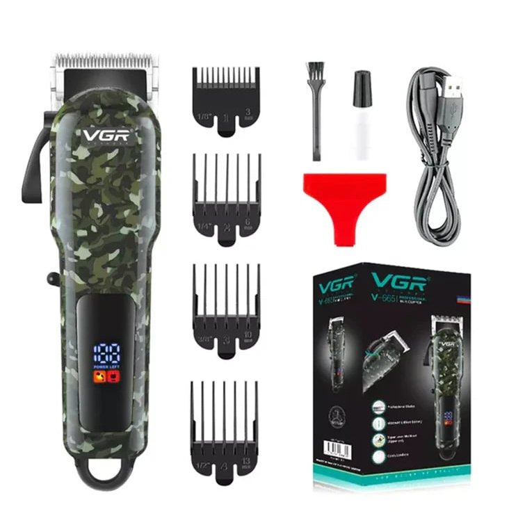 ماشین اصلاح وی جی آر V-665 دارای 4 شانه اصلاح، نمایشگر LED، باتری لیتیوم یون 2000mah، موتور 7000rpm و تیغه استیل، قابلیت استفاده به صورت بی سیم و باسیم را دارد.