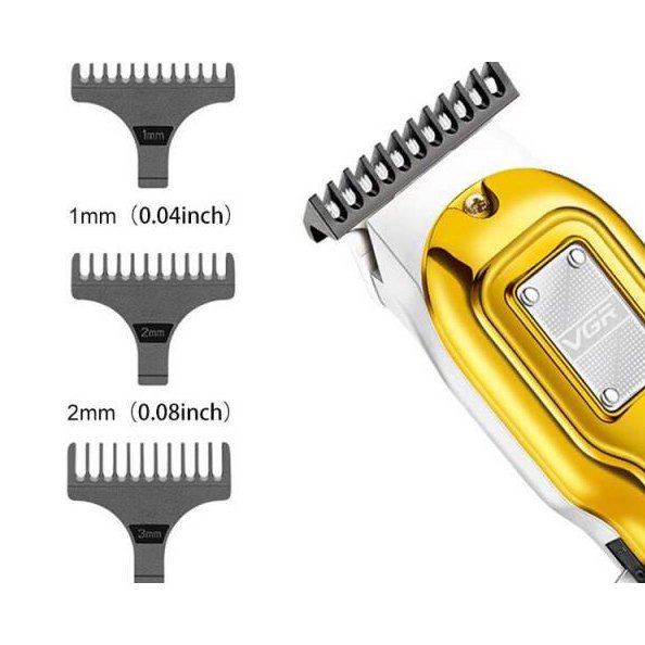 ماشین اصلاح وی جی آر V-919 دارای تکنولوژی تریم، عملکرد توربو، 3 شانه، باتری لیتیوم یون 600mah، صفرزن، خط زن، تیغه های خود تیز شونده استیل و نشانگر باتری است.