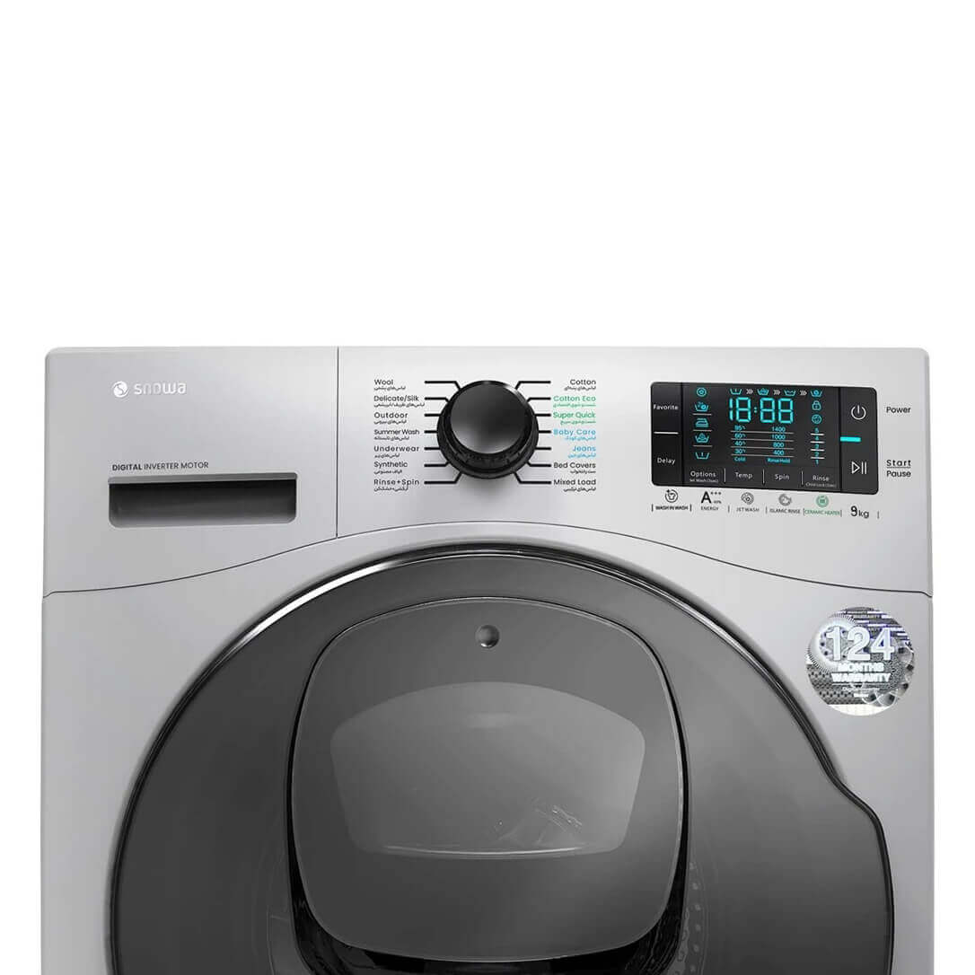 ماشین لباسشویی اسنوا SWM-94S60، کد قدیم F90S، دارای 14 برنامه، موتور Q-BLDC Drive، عیب یاب، قفل کودک، نمایشگر LED، نانوسیلور و قابلیت افزودن لباس حین شستشو است.