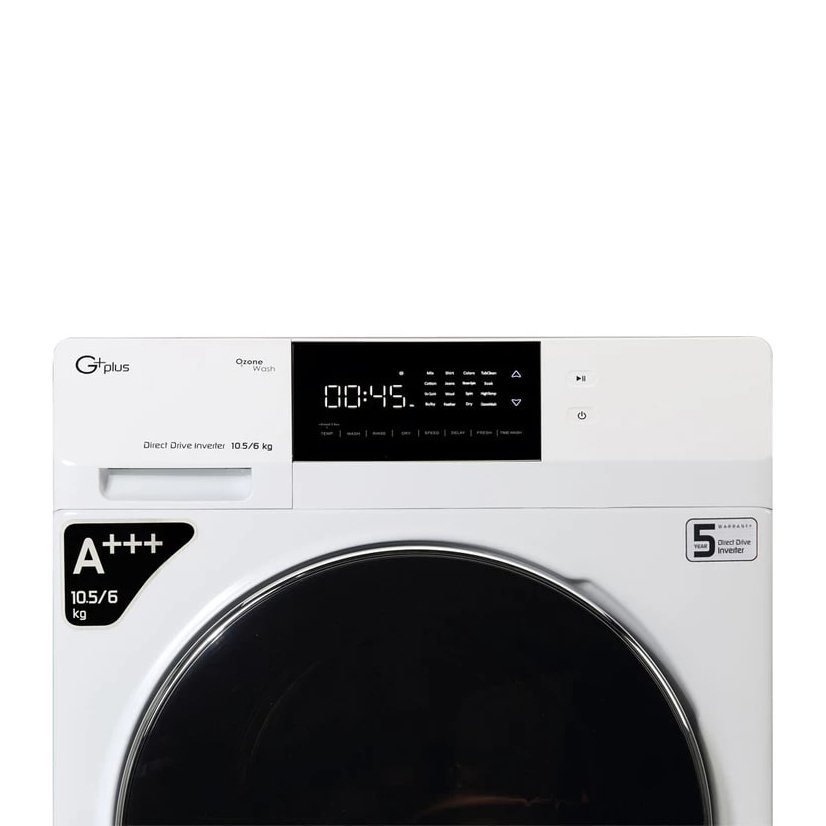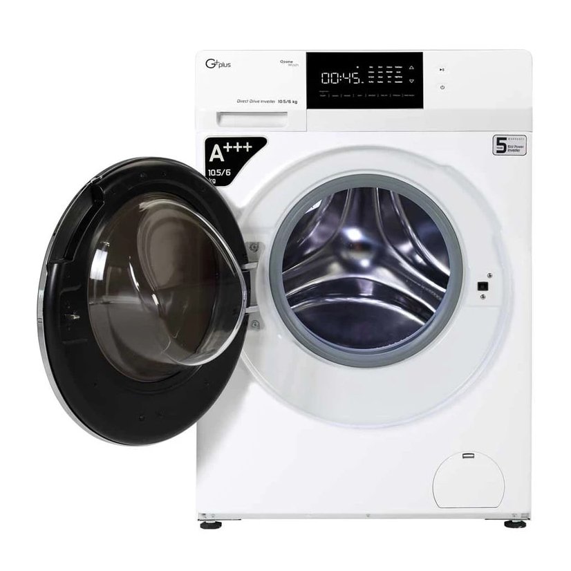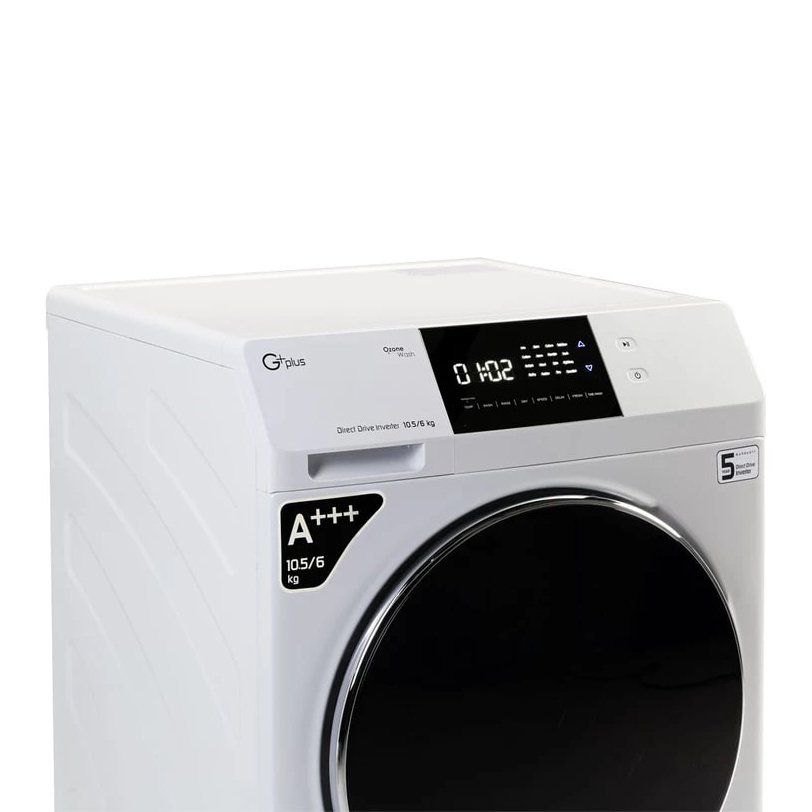 ماشین لباسشویی جی پلاس GWM-MD106W با ظرفیت 10.5 کیلوگرمی دارای 16 برنامه اصلی و 8 برنامه تکمیلی مانند Ozone wash و برنامه Go Quick است.