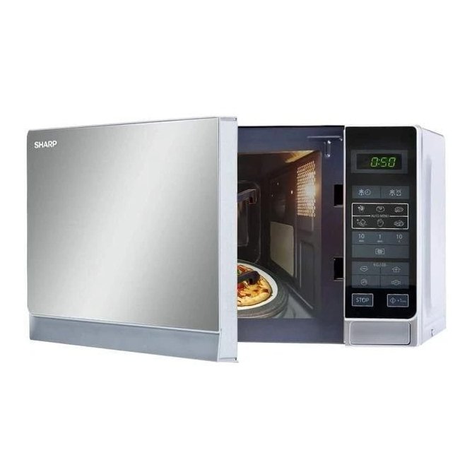 مایکروفر شارپ R-20MT با ظرفیت 20 لیتری مجهز به نمایشگر لمسی، درب آینه ای، صفحه گردان، قابلیت تنظیم زمان، امکان انتخاب توان در 11 سطح و 6 برنامه پخت می باشد.