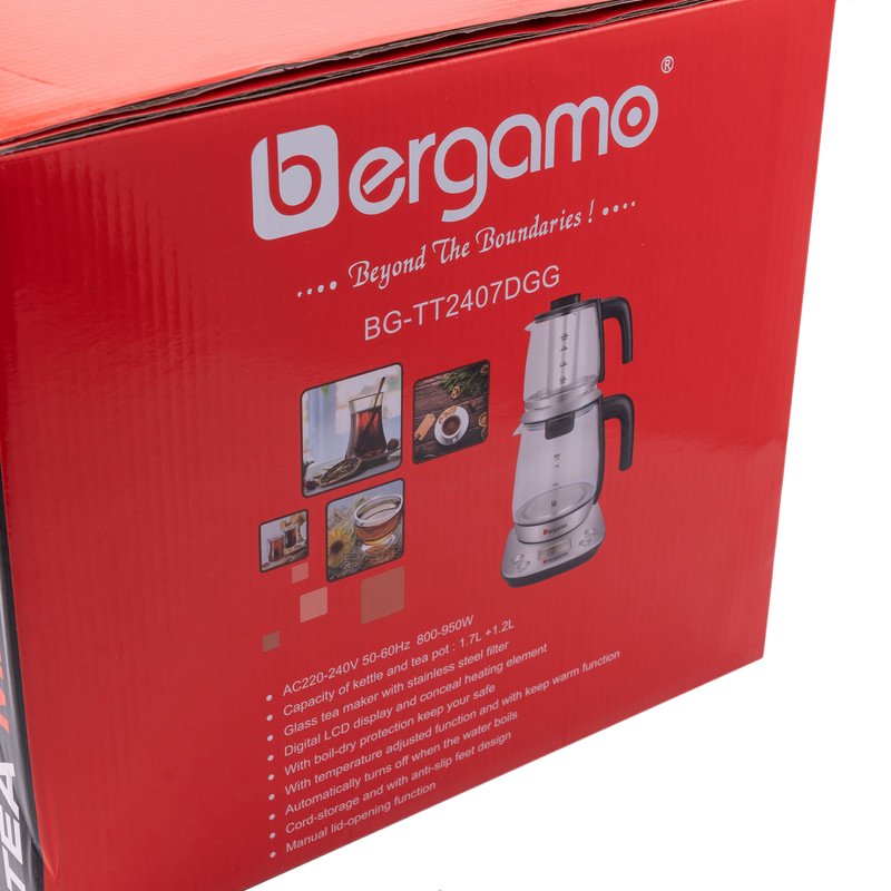 چای ساز برگامو BG-TT2407DGG از نوع روی هم بوده که کتری شیشه ای دارای ظرفیت 1.7 لیتری و قوری آن 1.2 لیتری می باشد. سیستم خاموشی خودکار از امکانات این محصول است.