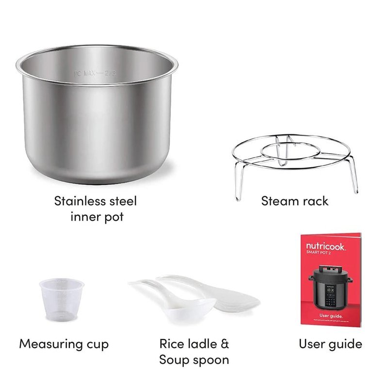 قابلمه داخلی استیل ضدزنگ، پایه مخصوص بخارپز، پیمانه مدرج، کفگیر و ملاقه |
